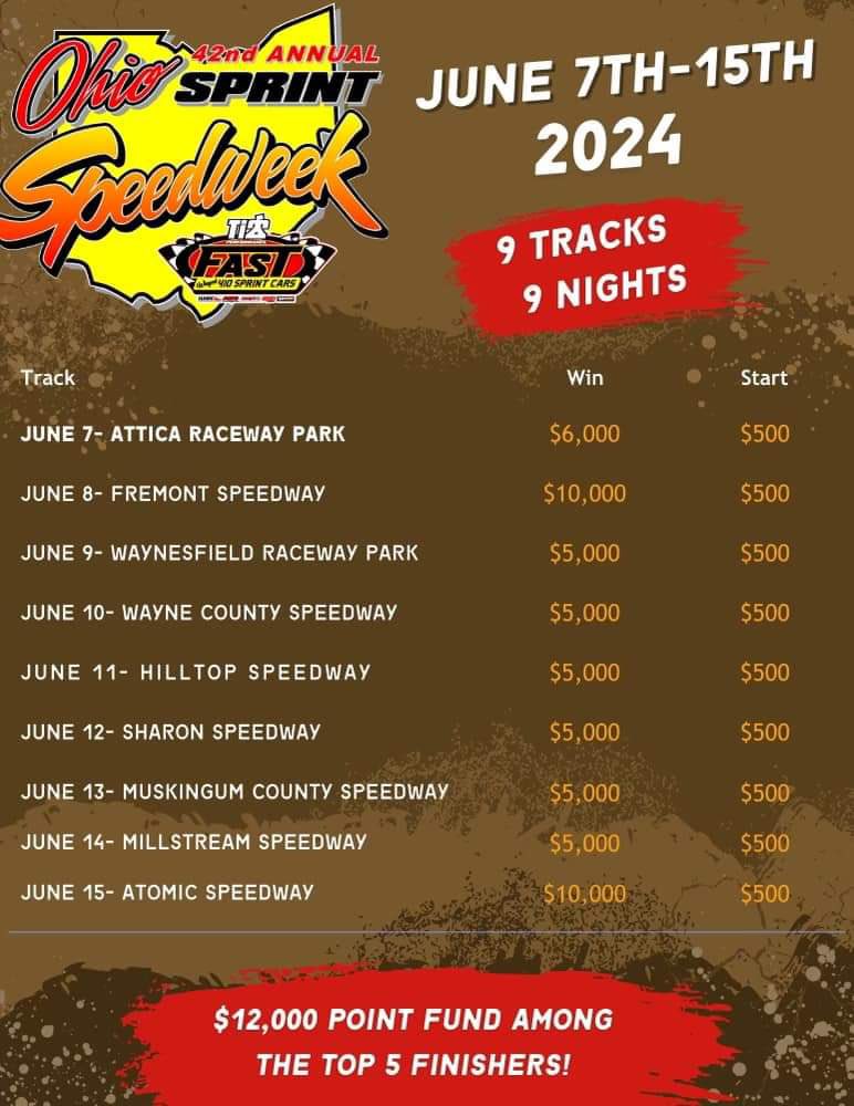 The 42nd Annual Ohio Sprint Speed Week has started. There will be 9 nights of racing. There were 53 cars at Attica last night. Maybe the lack of All Stars will bring out more low budget teams for some high car counts. Hopefully they have good weather, good crowds, and good racing.