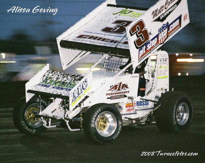 PETALUMA, CA (4-5-08) – Following a challenging night and a sixth place finish in 410 sprint car action at Silver Dollar Speedway in Chico Friday night, 16-year-old Alissa Geving of Penngrove, California, returned to Petaluma Speedway Saturday night to continue her campaign towards the 2008 All Pro point series title for 360 sprint cars. When the checkered flag flew at the conclusion of the 25-lap feature, Geving had concluded the night with an impressive second place finish. The feat was Geving’s second straight top three outing at her home track aboard the the Chick-O-Motorsports - Pit Stop USA #3x sprint car.