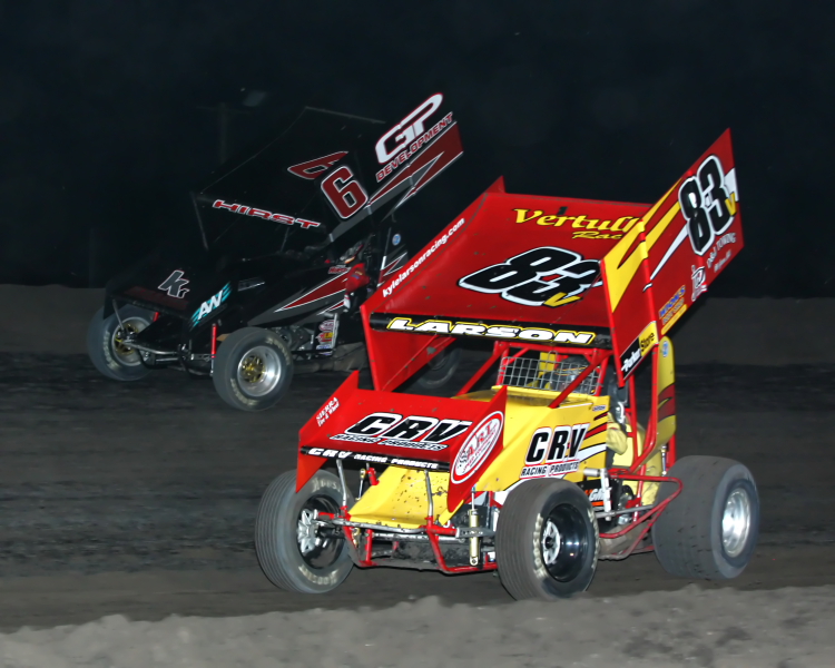 On Friday Larson qualified the CRV Racing Products/Eagle/Kistler fourth quick of the 35 cars pitted. He turned a sixth place start in his heat race into a third place finish, which placed him on the pole position of the main event.