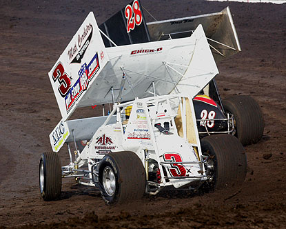 In the third heat race of the evening, Geving kept the capacity filled grandstands on the edge of their seat as she competed in the company of California’s best to finish an impressive second place. Geving started the 10-lap event on the outside of the second row. She quickly charged into the second position at the waving of the green flag. After moving into the bridesmaid position, Geving’s drive to the finish line was far from over as she battled veteran drivers Colby Wiesz of Colfax and defending four time series champion Andy Forsberg of Auburn. Wiesz drove to the inside of Geving to steal the position momentarily, only to have Geving live up to latest knick name, angel in flames, as she fired the Gary Geving powered #3x back into the second position to secure the position and a starting position in the 30-lap feature event.