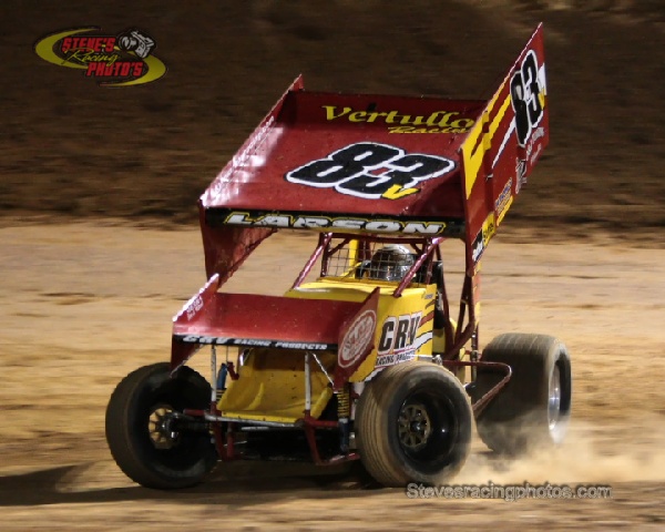 Larson started the CRV Racing Products/Eagle/Kistler 83v sprint car 15th in the 22 car field for the GSC feature. From the start Larson was having troubles keeping the car underneath him. As the race wore on Larson was falling back and just trying to avoid causing a caution. Finally, on lap 20 Larson got sideways in turn four and, as Brandon Carey tried to avoid Larson, the duo came together on the frontstretch, which sent Carey into one of the infield tires, ending his night. At that point Larson also exited the race, credited with a 20th place finish, while Tim Kaeding went on to win the 30 lap event.