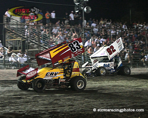 With 40 cars in the pits Larson qualified the Dave and Debbie Vertullo CRV Racing Products/ Eagle/ Kistler tenth fast. A second place finish from fourth starting in his heat race secured for Larson an automatic transfer into the night’s A-main event. The inversion draw gridded the 83v sprint car outside of Brett Miller on the front row.