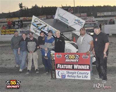 Alger, WA- Barry Martinez is officially geared up for the Van's Equipment Rentals & Sales Jim Raper Memorial Dirt Cup at Skagit Speedway. After fading back to third on the initial start of the Associated Asphalt 410 main event, the Lynnwood WA resident battled his way back into contention in his Artisan Homes #66 J&J, powering around the inside of the track. After passing Jesse Whitney for second, Martinez set sail for race leader Jason Solwold who had taken the lead from Whitney on lap eight. Mired in heavy traffic, Martinez powered under Solwold coming off the fourth corner on lap fifteen to nose into the lead. Solwold saw Martinez and went to go for his lead back but made contact with lapped traffic, causing a spin out and collecting fourth place running Rick Fauver with him. On the restart, Colton Heath would blow by Whitney for second and set sail for the leader Martinez. But it was not to be, as Martinez masterfully navigated the final laps of the Skagit 3/10 clay oval to take his second win of the year. Heath in the Sanford Tire #5x XXX finished second, with Whitney coming home third in the Precise Machining #88 Eagle. Whitney also set quick time. Heat wins went to Heath, Cory Chamberlain in the Bob & Lori Scott owned #7s Maxim and Chad Hillier in the APC Powdercoating #38 J&J.
