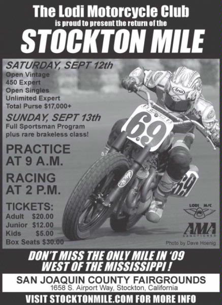 This would be great to see as I lived in Stkn for 6 yrs in the late 70's-early 80's. They tried getting an auto race there but the horsey people had all the cheap stupid reasons you could think of so it never got off the ground and scheduled. Did manage to see a race at SJ with Joe Leonard as the grand marshall. He walked slow and with a cain. I am sure Springfield, ILL is great stuff. A fantastic photo opportunity. Go see bikes on a mile,