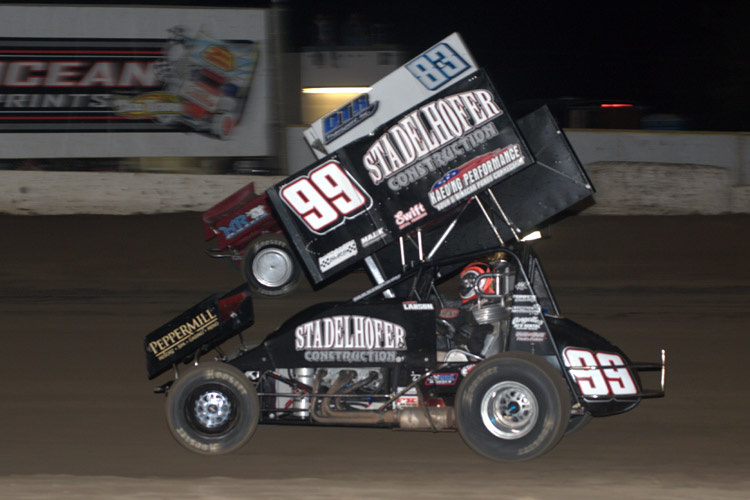 Over the next few laps Larson began to reel in the lead foursome as the action at the front was furious. As the lead pack began lap nine Larson had a run on the bottom of the frontstretch as Tarlton looked to make something happen with Day. Just when Larson appeared to have the momentum to carry past Tarlton, the Easton, California driver made a dramatic move to the low side that contacted the Stadelhofer Construction/Peppermill Casino sponsored car and sent it veering into the implement tire in turn one.