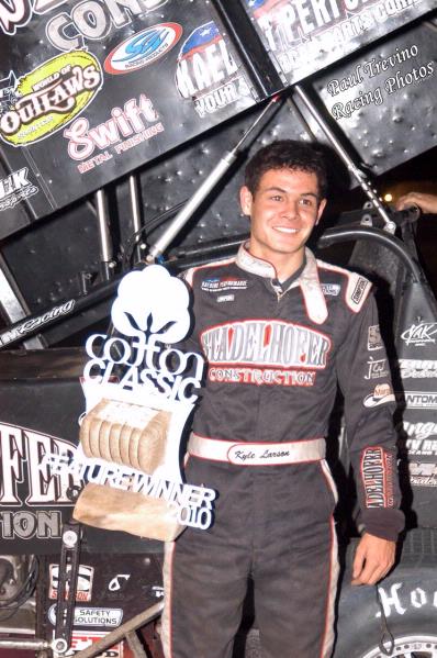 Watsonville and Hanford, California - October and 16, 2010. In his prior 15 main event wins in his four year career, 18 year old Kyle Larson had been unable to add a marquee event victory to his list of typically California Golden State Challenge and Civil War Series wins. But the 2010 GSC champion changed all that Saturday night at Giant Chevrolet-Kings Speedway as win number 16 was accomplished in the final California winged 410 sprint car race of the year, the $5,000 to win Cotton Classic.