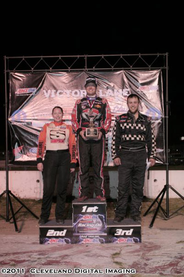 Whatever the crew threw at the 3f obviously worked because Ensign felt the difference as soon as the green flag dropped on the 100 lap feature. "The car was sticking and I could diamond off the corners and pass cars for the first time. I was passing cars and then I could think about racing." As the laps wore on Ensign was making steady progress. "I made a couple adjustments to the wedge from the cockpit when fuel started to burn off and we just kept getting faster and faster." Ensign's fortunes would take a turn for the worse however while running 5th when teammate Tim Barber spun in front of him, sending sparks flying from a damaged nerf bar. "I'd have run with it that way if it meant keeping my position, but officials called me in." Officials would pull Ensign to the infield and remove the damaged bar and Ensign was given his spot back in the lineup since it was the officials who made the call to stop him.....if he could make it there in time as the lights went out. With Ensign scrambling for position, he got back up to his 4th spot as the green flag signaled the restart and Ensign was back on the chase. "I didn't really know how hard I could go since I'm new to this tire thing. Was I burning off the tires? All I know is it was getting late and I was fast."