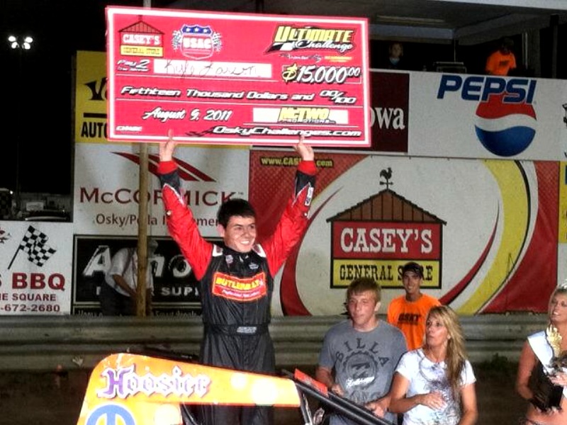 Oskaloosa, Iowa – August 9, 2011. The impressive hot streak of Kyle Larson continued Tuesday night in his maiden voyage in the Hoffman Auto Racing Dynamics, Inc. Mean Green #69 sprint car as the 19 year old ruled in Terry McCarl’s McTwo Promotions – Casey’s General Store Ultimate Challenge at the Southern Iowa Speedway in Oskaloosa, Iowa. The driver from Elk Grove, California won every event he entered, highlighted by his first USAC AMSOIL National Sprint Series win in the highest paying non wing sprint car race in the country. The only event Larson was unable to capture was the foot race for a Winters rear end for the night’s heat race winners, where he finished third.