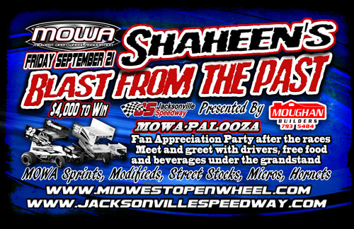 (Bill W) September 18, 2012 – A big doubleheader weekend is in store for the Midwest Open Wheel Association as they hit a pair of venues they are familiar with for some big cash! On Friday night, September 21, they will compete at the "Shaheen's Blast from the Past" presented by Moughan Builders, aiming for the top prize of $4,000 in Jacksonville, Illinois. On Saturday night, the show moves across the Mississippi River to the 34 Raceway in West Burlington, Iowa.