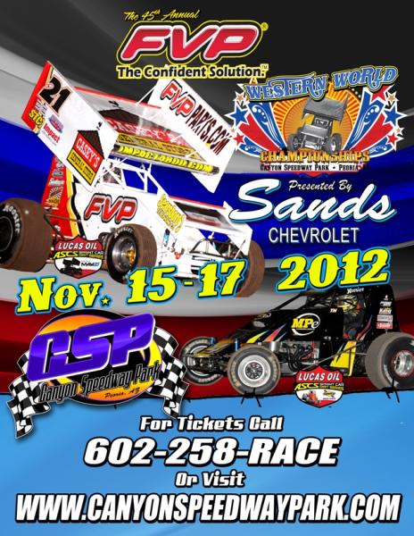 GET A FREE DVD SET! Order the Pay Per View Package of the 45th Annual Western World Championships ASCS Wing 360 and Non Wing Sprint Car extravaganza LIVE from Canyon Speedway Park before November 1, 2012 and get a FREE Dual Disc DVD Set of the event. $50 for a Weekend Pass.