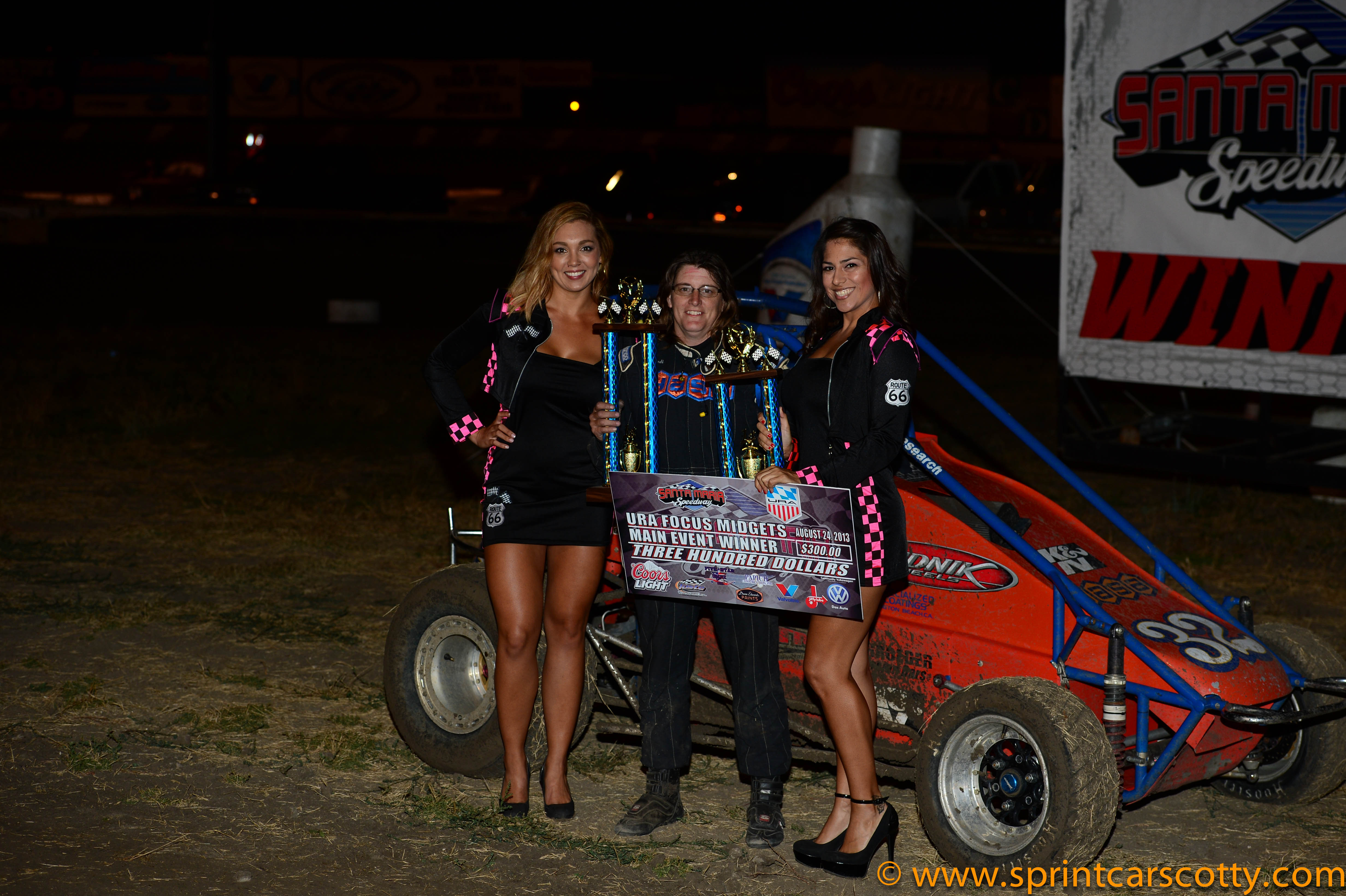 "Mad" Matt Mitchell & Crew celebrate their long overdue Santa Maria Speedway Main Event Win with the Route 66 Girls and some cool Coors Light!