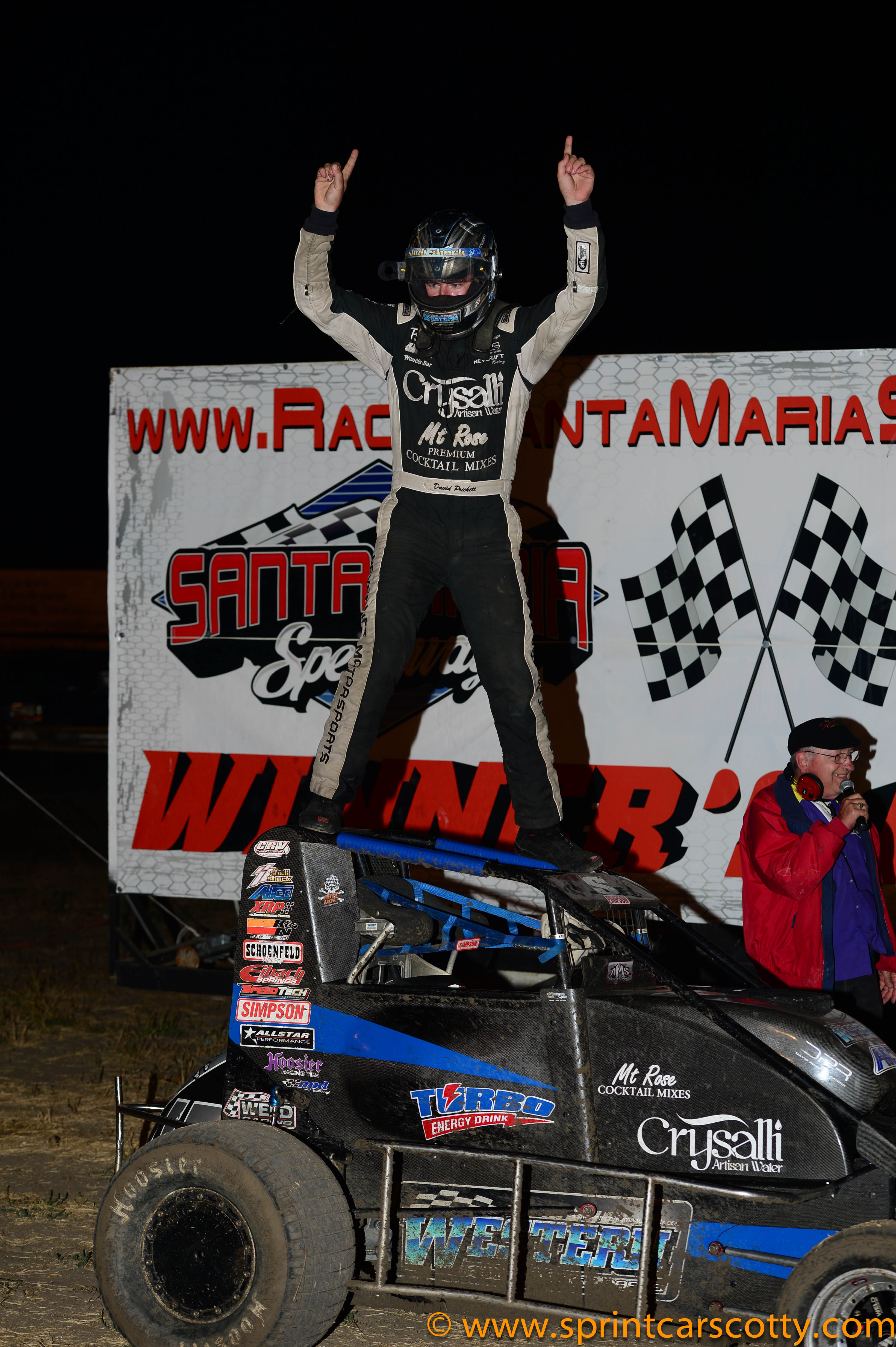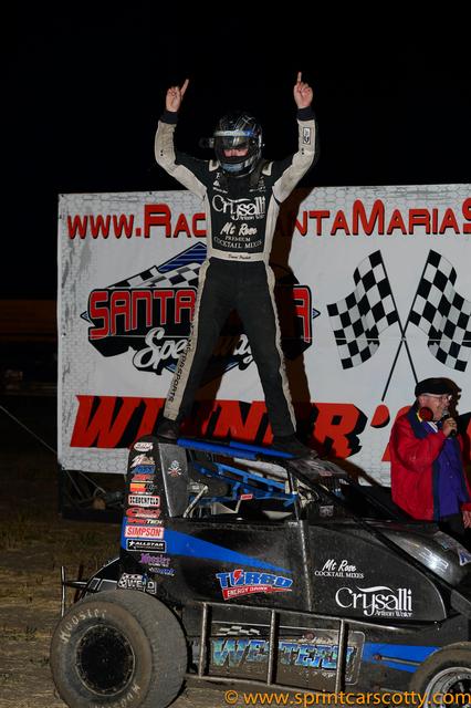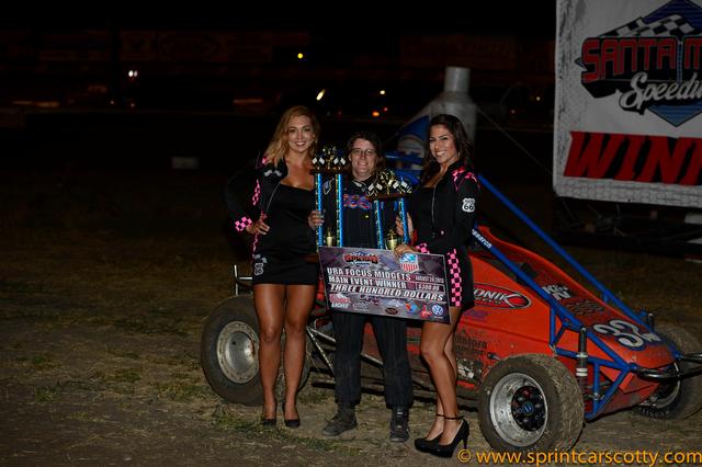 URA Unlimited Midget Winner David Prickett of Fresno, California celebrate's his Santa Maria Speedway Main Event Win.