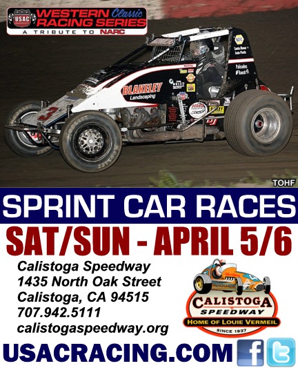 USAC WESTERN CLASSIC SPRINTS OPEN 4TH SEASON AT CALISTOGA DOUBLEHEADER By Lance Jennings SANTA MARIA, CA – MARCH 26, 2014... The fourth season for the USAC Western Classic Racing Series (WCRS) will kick-off April 5th and 6th with a doubleheader at the scenic Calistoga Speedway. The action packed showcase at the Napa County Fairgrounds will also feature the famed World of Outlaw Sprint Cars as the Pit Gates will open at 1:00pm, Spectator Gates will open at 4:00pm, Qualifying at 6:00pm, with Racing set for 7:00pm.