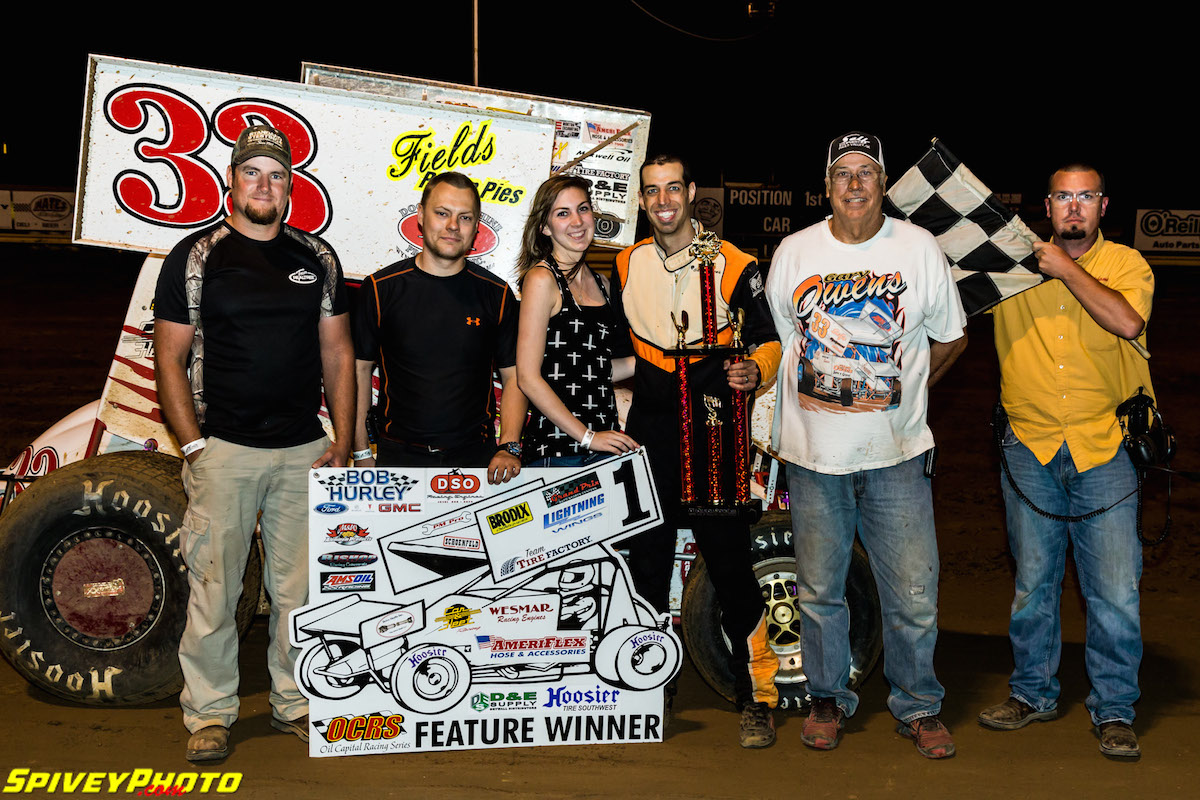 Ada Oklahoma (May 10, 2014) – Gary Owens of Pauls Valley Oklahoma won the Sixth Annual Harold Leep Jr. Memorial tonight at the Oklahoma Sports Park in the first of three Oil Capital Racing Series stops to OSP in 2014. The win makes the second year in a row Owens had captured the HLJ memorial race. Owens started on the outside front row in his Glen Owens Sand and Gravel / Fields Pecan Pie / Eagle sprinter and bolted straight into the lead from the very beginning with pole position starter Derek Cottrell giving chase in the Platco Electrical XXX followed by Fred Mattox in his Pace Engineering XXX.