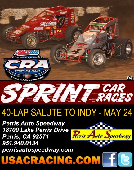 Perris Auto Speedway's annual "Salute to Indy" unfolds May 24 at the southern California oval. The AMSOIL USAC/CRA Sprint race will give Damion Gardner another chance to extend his series point lead which stands at 39 points over Nic Faas.