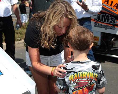 Alissa Geving of Penngrove, takes a moment to autograph a shirt for seven year-old Dustin Lind of El Dorado Saturday during the first annual Family Chevrolet Tribute to Al Hinds Sprint Car Show and BBQ. Geving was one of 16 drivers on hand for the event. Photo courtesy of Steve Lamothe, www.stevesracingphotos.com.