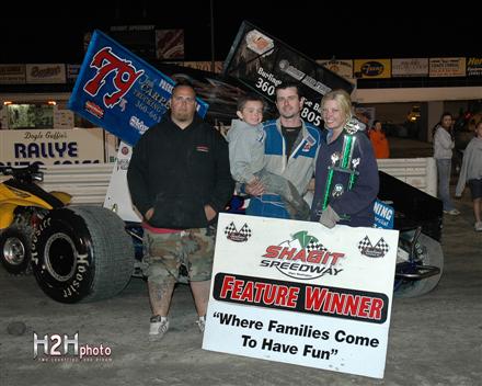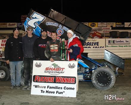 Alger, WA- Roger Crockett made the most of his first appearance of the year at Skagit Speedway, winning the Dirt Cup Tune Up night. The Outlaw 410 Sprint A Main started with Travis Rutz taking the lead in his Rudeen Racing #26 from his inside pole position with Crockett settling into the two hole in the Omlid & Sweeney Fire & Security #7n. Rutz and Crockett streaked away from the field, with Travis periodically stretching the lead. Every time Rutz stretched, Crockett took his car to a different line on the track and closed the gap. Then on lap 22, with Rutz knee deep in lapped traffic, Crockett found an open line through the top side of turn four and made the definitive pass on Rutz en route to the win. Jason Solwold ran third in the Xtreme Oilfield Technology #39c. Heat race wins went to Jayme Barnes in the Here 2 Wire #9, Seth Bergman in the Corridor Electric #23, Jason Bloodgood in the Big John Motorsports #38 and Barry Martinez in the Artisan Homes #66. Danielle Huson won the B main in the Tri County Truss #73. Rutz was quick time.