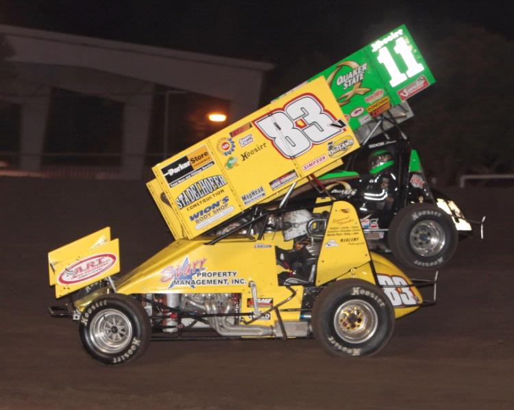 On the opening lap of the star studded event Larson jumped past 15th starting three-time defending World of Outlaws champion Donny Schatz and Roger Crockett. With third starting Tim Kaeding crashing out on lap two and Larson passing Brad Furr on lap four, the Vertullo Racing/Stadelhofer Construction 83v had advanced four positions to 14th.