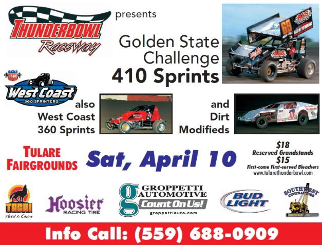 TULARE, CA – APRIL 7, 2010…The USAC West Coast 360 Sprint Car Series will hold their fifth round of competition this Saturday night, April 10th, at Tulare's Groppetti Automotive Thunderbowl Raceway. The Chris & Brian Faria Memorial will also showcase the winged Golden State Challenge 410 Sprint Cars and the Central California Modifieds.