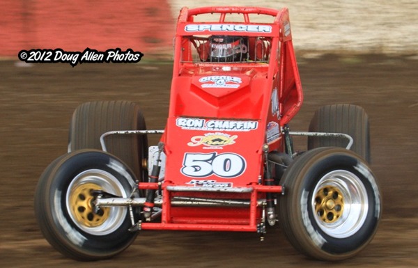 PERRIS, CA – APRIL 1, 2012… Last Saturday night, Mike Spencer of Temecula took the lead from R.J. Johnson and held off Nic Faas to win the Amsoil USAC/CRA Sprint Car feature at Perris Auto Speedway. Spencer swept the show, earning the "Dean Thompson Award" for setting fast time, winning his heat race, and claiming the 30-lap main event. However, there is much more to this story.