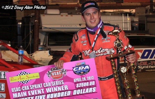 PERRIS, CA – APRIL 30, 2012… Last Saturday night, Temecula's Mike Spencer took the lead from Ryan Bernal on lap nine and fought off a late charge from Matt Mitchell to score his second victory of the year. With the 30-lap triumph at Don Kazarian's Perris Auto Speedway, the four-time Amsoil USAC/CRA Sprint Car Champion has taken over the points lead heading to Hanford on May 19th.