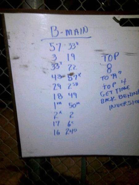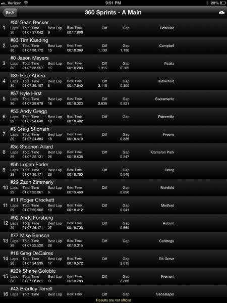 Becker, TK, Meyers, Rico and Hirst top five. Prayers going out for Tyler Wolf who was injured during the A Main and transported to a hospital.