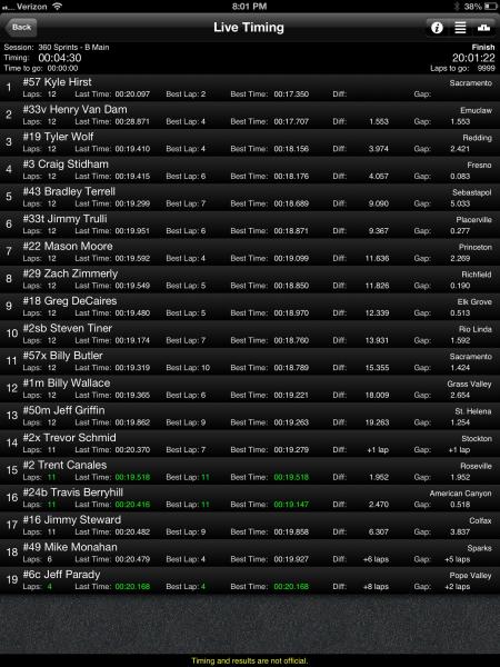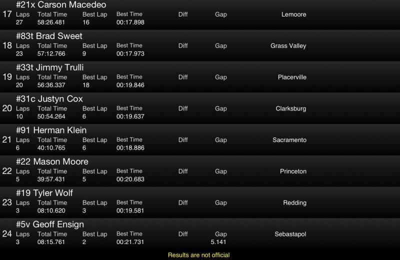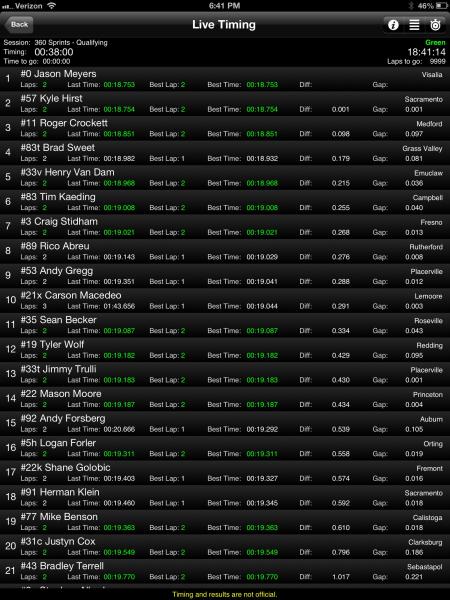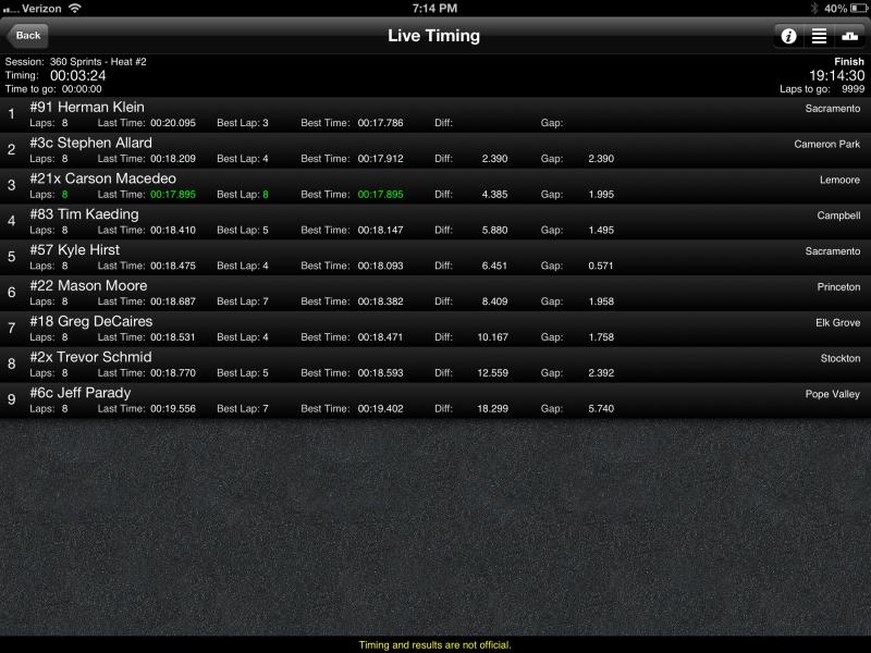 If you have a smart phone "Race Monitor" has live timing of the Calistoga show. Meyers is fast time followed by Hirst, Crocket, Sweet, Van Dam and TK.