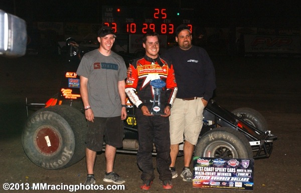TULARE, CA – MARCH 17, 2013... Hollister's Ryan Bernal had a weekend to remember at Tulare's Thunderbowl Raceway. Bernal not only claimed back-to-back features at the lightning fast 1/3-mile oval, he also swept the Saturday night program. The former Rookie of the Year led all 25-laps to claim his series leading eleventh career USAC West Coast Sprint Car main event and was followed by Richard Vander Weerd, Bud Kaeding, Austin Liggett, and Jace Vander Weerd.
