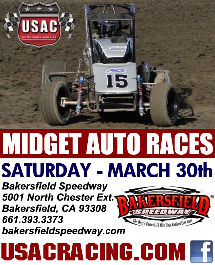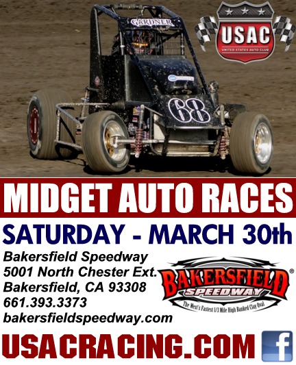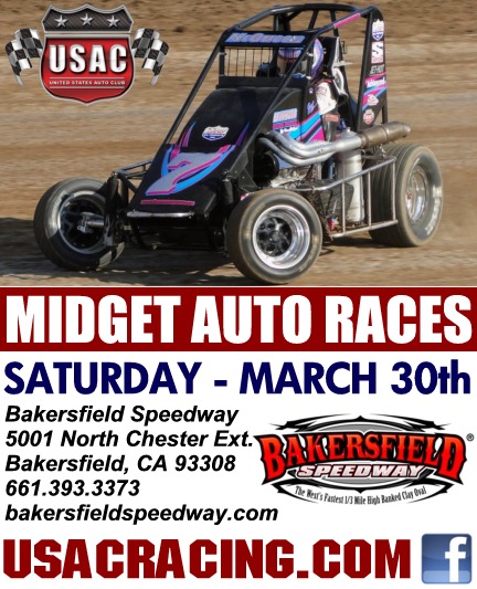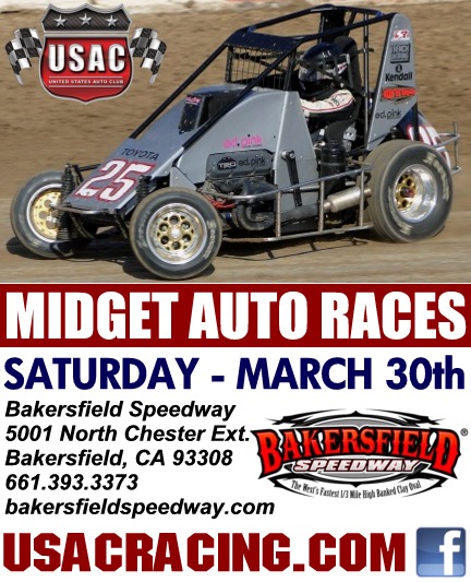 USAC WESTERN STATES MIDGETS along with IMCA Sport Mods, Mini Stocks & NMRA Midgets this Saturday night March 30th @ Bakersfield Speedway. Adults $15 Kids 6-12 $5 5 and under FREE