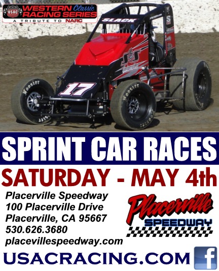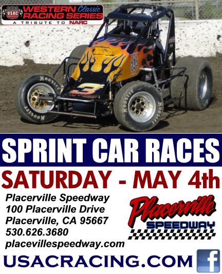 SANTA MARIA, CA - APRIL 30, 2013... This Saturday, May 4th, the traditional sprint cars of the USAC Western Classic Racing Series (WCRS) will make their only appearance of the year at Placerville Speedway. The action packed card will also feature the popular Limited Late Models and Pure Stocks. The Spectator Gates will open at 5:00pm, Time Trials will start at 6:30pm, and Racing is set to begin at 7:00pm.