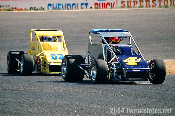 Jared Consani in the Consani #4j and Matt DeMartini in the Moeller Bros. #03 during the CASA sprint series "Firecracker 100" at Champion (T-Car) Speedway, July 3, 2004