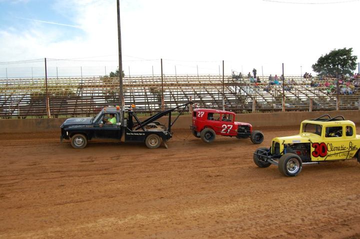 Andy on the HOOK!! This kinda somes up the night! As they say on Hee Haw, If It Weren't for Bad Luck, We'ed have No Luck at All!! The 27 lock a trans, the 53 lost a coil, Tom didn't make it down from Joplin due to a piece of steel in his eye, and the new motor in the 9 car that I just got going a few hours before race time lost a coil wire in the heat, starter gave up after the race, and it was running on 5 cylinders at the end of the feature!!