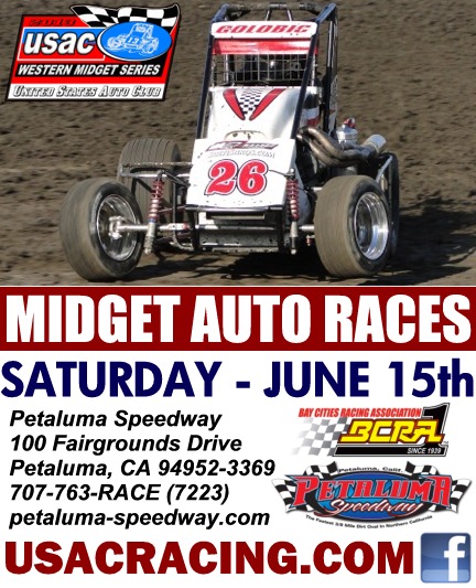FOR IMMEDIATE RELEASE JUNE 10, 2013 DICK JORDAN 13-117 WESTERN DIRT MIDGETS AT PETALUMA; CHIVELLO WINS USAC/BCRA RACE AT MADERA Petaluma (Calif.) Raceway hosts the Honda USAC Western Dirt Midgets Saturday night and point leader Ronnie Gardner will try to protect a 23-point lead in the standings. The event is co-sanctioned by BCRA. Shane Golobic, who won the last USAC Western Dirt Midget race at Placerville, also won last year’s race at Petaluma. Nick Chivello of Manteca, Calif. passed Scott Pierovich on the 28th lap Saturday night and led the final three laps to win the 30-lap "Pombo/Sargent Classic" USAC/BCRA Honda Western Midget race at Madera (Calif.) Speedway. Chivello led the first 21 laps and Pierovich the next six before the final pass. Tanner Swanson finished second ahead of Chad Nichols, Scott Pierovich and David Goodwill. Chivello piloted the Hubbard’s Auto Parts/Red Top Electric Spike/Esslinger. The Honda USAC Western Pavement Midgets, led by point leader Chad Nichols, return to Madera July 13. HONDA USAC WESTERN MIDGET DIRT POINTS: 1-Ronnie Gardner-413, 2-Jake Swanson-390, 3-David Prickett-338, 4-Cody Swanson-219, 5-Shannon McQueen-197, 6-Scott Pierovich-173, 7-Trey Marcham-168, 8-Randi Pankratz-152, 9-Bryan Clauson-143, 10-Kody Swanson-140. HONDA USAC WESTERN MIDGET PAVEMENT POINTS: 1-Chad Nichols-163, 2-Tanner Swanson-141, 3-Scott Pierovich-124, 4-Dan Gundo-120, 5-Ken Nichols-109, 8-Frankie Guerrini-108, 7-Nick Chivello-102, 8-Kody Swanson-72. HONDA USAC WESTERN MIDGET POINTS: 1-Ronnie Gardner-352, 2-Jake Swanson-334, 3-David Prickett-294, 4-Scott Pierovich-262, 5-Cody Swanson-219, 6-Kody Swanson-212, 7-Frankie Guerrini-212, 8-Shannon McQueen-178, 9-Trey Marcham-169, 10-Tanner Swanson-164.