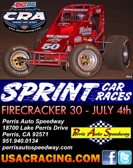 SANTA MARIA, CA – JUNE 29, 2013… On Thursday, July 4th, race fans in Southern California will celebrate Independence Day in style at Perris Auto Speedway. The cars and stars of the Amsoil USAC/CRA Sprint Car Series will return to their “home track” for the annual “Firecracker 30 & Sky Concert.” “The Power of Purple Night” benefiting the City of Perris Relay For Life and the American Cancer Society will also feature the PAS Senior Sprint Cars, California Lightning Sprints, and PAS Young Gun Sprint Cars presented by The Sprint Car Driving Experience. The spectator gates will open at 3:00pm, an autograph session is set for 3:15pm, games on the front straightaway with kids and drivers will be at 3:45pm, and live entertainment is also planned. Racing at "America's Premier Dirt Track" will start at 7:00pm and the facility will host one of largest and best fireworks shows in California.