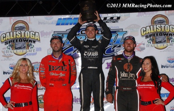 KYLE LARSON SCORES $10,000 LOUIE VERMEIL CLASSIC SPRINT CAR FINALE by Lance Jennings CALISTOGA, CA – SEPTEMBER 3, 2013... After competing in Atlanta the day before with the NASCAR Nationwide Series, Elk Grove’s Kyle Larson led the final two laps to claim the “6th Annual Louie Vermeil Classic.” Sunday’s $10,000 USAC Western Classic and Amsoil USAC/CRA Sprint Car triumph at Calistoga Speedway was Larson’s third career WCRS victory. Bud Kaeding, Austin Williams, fast qualifier Mike Spencer, and Bradley Terrell rounded out the top five drivers.