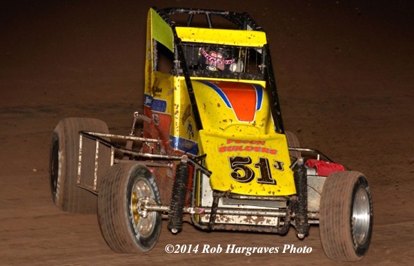 Driving Bobby Martin’s #51 Weiler Farms / Pecon Builders Spike, R.J. Johnson grabbed the early lead from the pole position. Preferring to run the low line as track conditions were changing, Johnson soon had to contend with Alex Schutte on the outside line. While the race was shortened after Chad Nichols flipped his mount through the turn three billboards, Schutte would continue his pursuit off the cushion. Using a veteran move, Johnson changed to Schutte’s high line and streaked away to the checkered flags. In time trials, R.J. qualified fourth out of the nine cars in attendance and won the night’s only heat race. It was a memorable night for Johnson as he took second in the companion USAC/CRA Sprint feature.