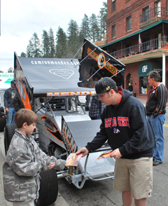 Camron Mendes enjoys visiting with a young fan in historic Placerville last weekend despite the rain out of the Placerville Speedway opener.- Photo by Phil Hamilton