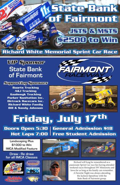 to State Bank of Fairmont. The show will include 360 Sprint Cars with a top pay