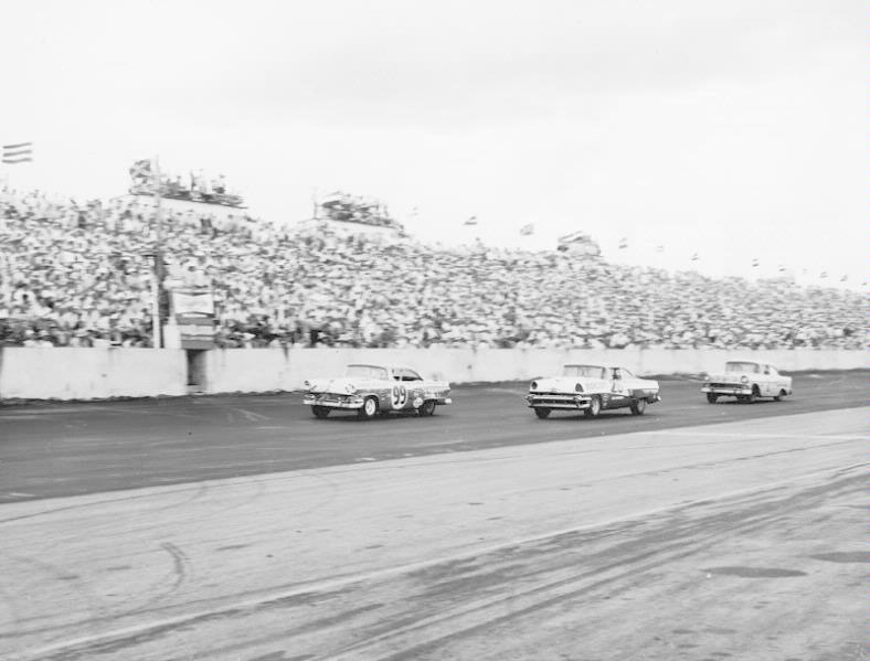 August 3, 1956 -- The only appearance of NASCAR's Grand National (now Sprint Cup) Circuit at Fairgrounds Speedway. Lee Petty leads the most laps in a Plymouth on the half-mile, but Jim Paschal wins in a Mercury.