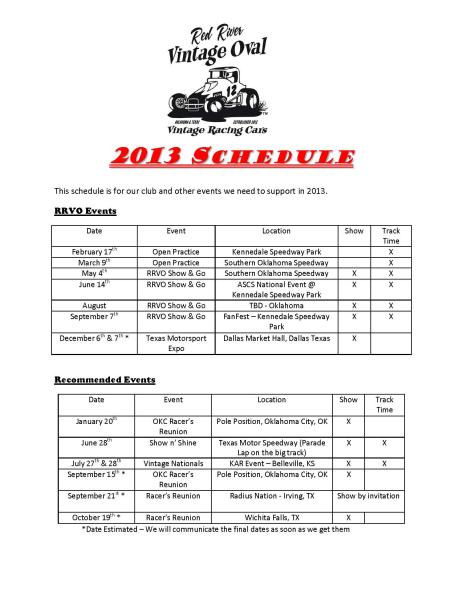 All we have our 2013 schedule ready to be sent out. We have dates in both OK and TX. Please send us an email to [email protected] and we will send you a copy. We look forward to seeing everyone at the track.
