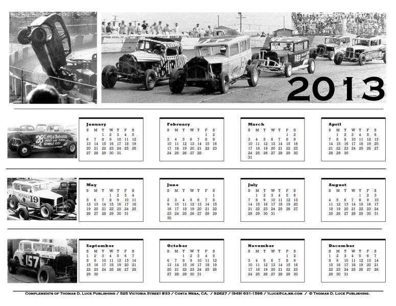 Here is a FREE 2013 California Jalopy Racing Nostalgia Calendar. It is 8 1/2 X 11 inches in size in the Landscape format. If you are unable to extract the Calendar from the Photo Gallery section please send me an email and I will send you a copy back to your email address. Merry Christmas. Enjoy. Thomas Luce [email protected]