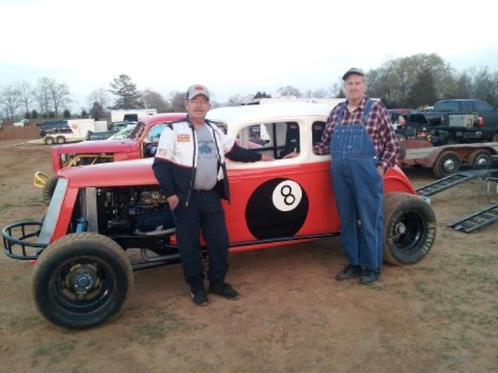 Well the 8-ball made it out on the track to race for the first time in 40+ years!! In this picture with the 8-Ball is the driver from the sixties, R.G. Hamilton and on the left side is John "Andy" Anderson who retored the Flathead Coupe!!